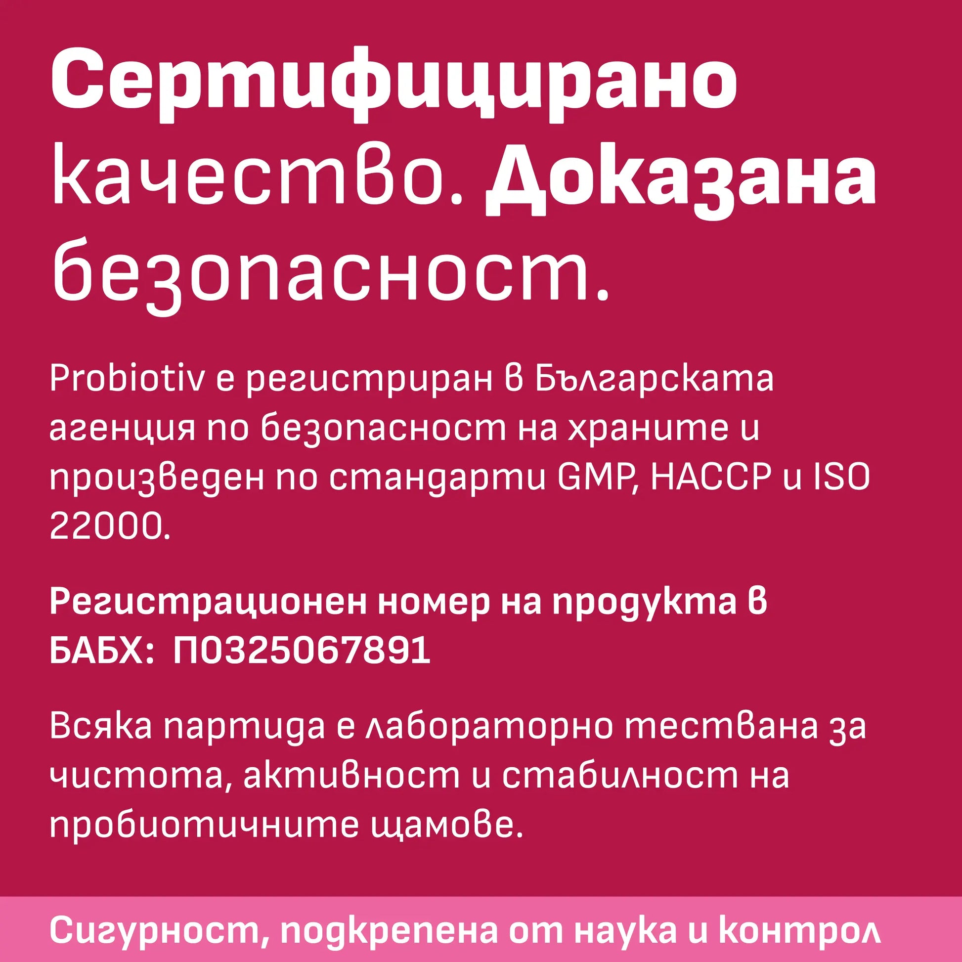 Всички продукти на Probiotiv притежават сертификати ISO 9001, ISO 22000 и GMP. Всички наши продукти се произвеждат в Европейския съюз и са регистрирани и одобрени от Българската агенция по безопасност на храните (БАБХ).