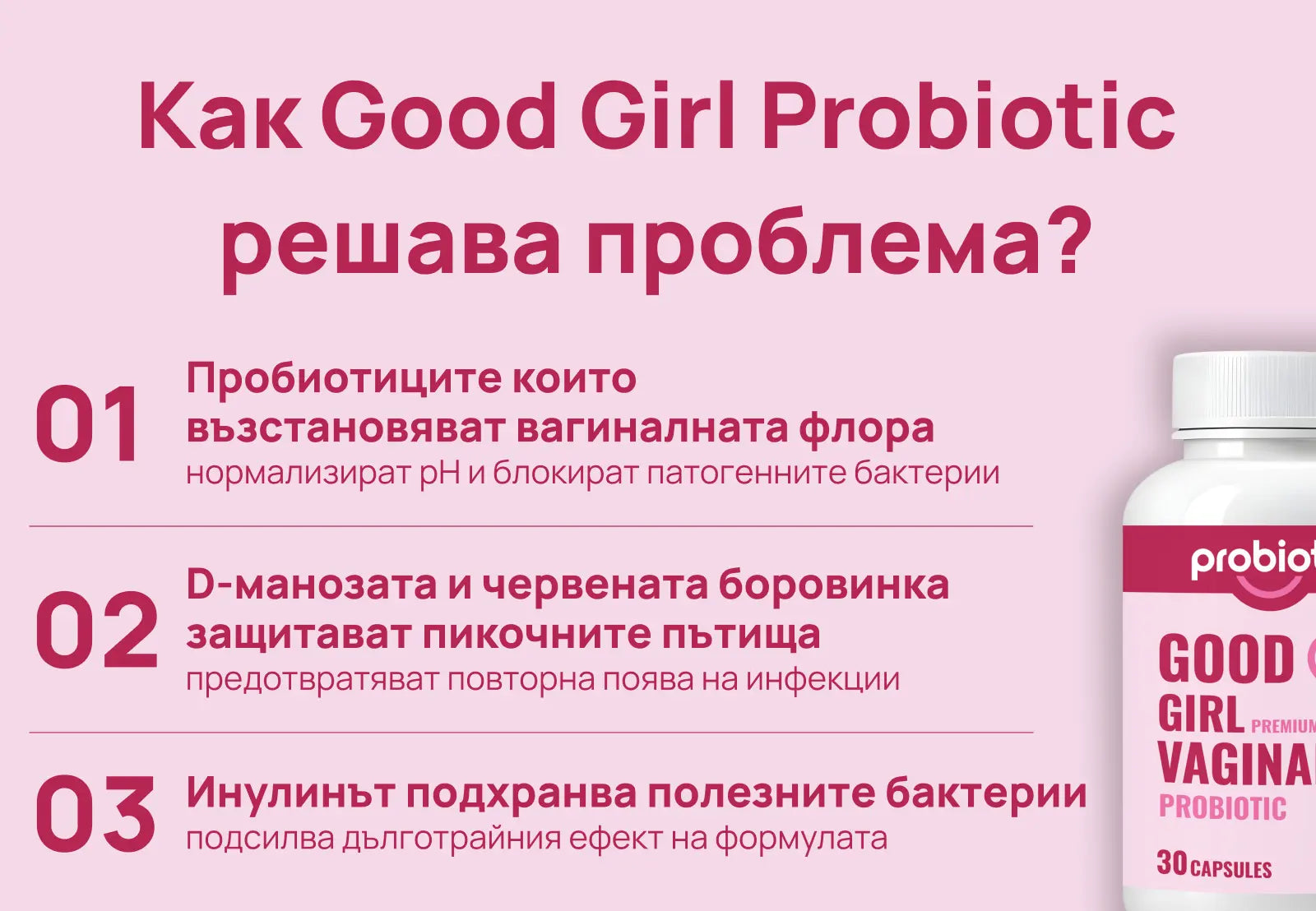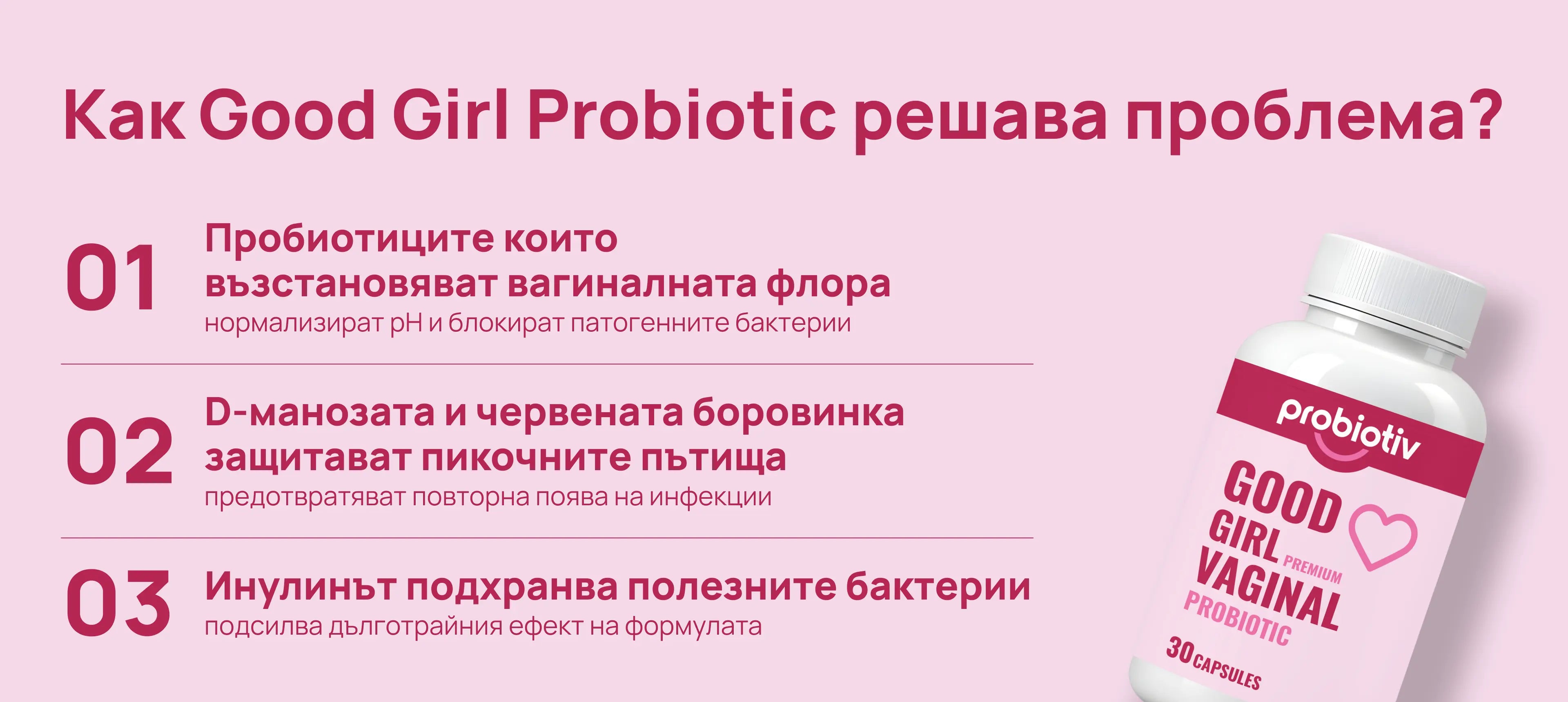Good Girl съдържа щамове с клинично доказано действие и натурални съставки, подходящи за ежедневна употреба без странични ефекти.