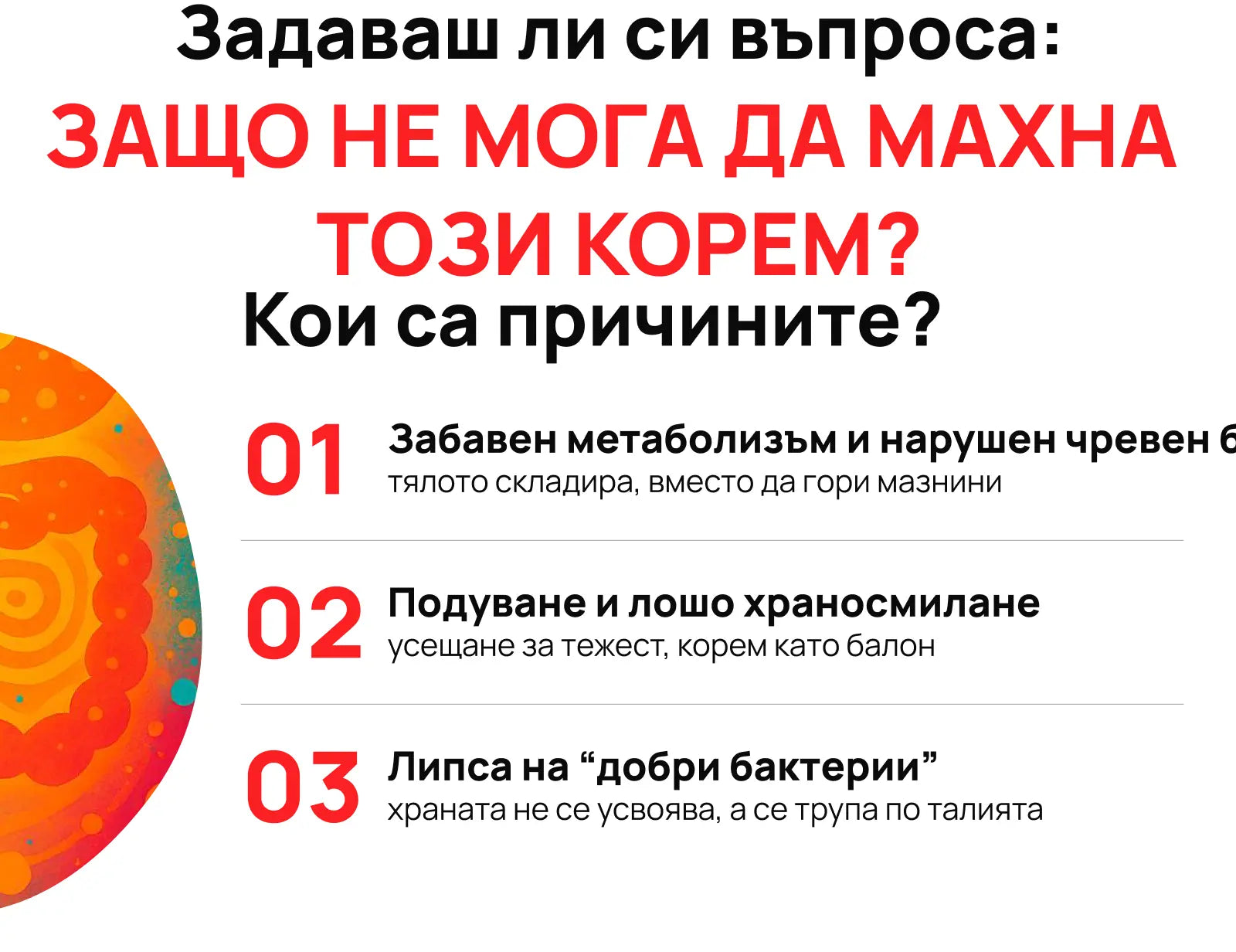 Без балансирана чревна флора и активен метаболизъм, отслабването остава мираж. Нашата формула с пробиотици, матча и инулин атакува точно коремните мазнини, като засилва метаболизма и спира подуването.